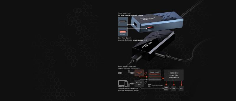 The KA17 features two USB Type-C ports. One is the typical port used to connect to other devices such as phones, tablets and computers. The orange port on the side is designed for use with an external power supply. When an external power supply is connected to this port, the KA17 can achieve higher power output and better performance without consuming the battery of your phone or other connected device.