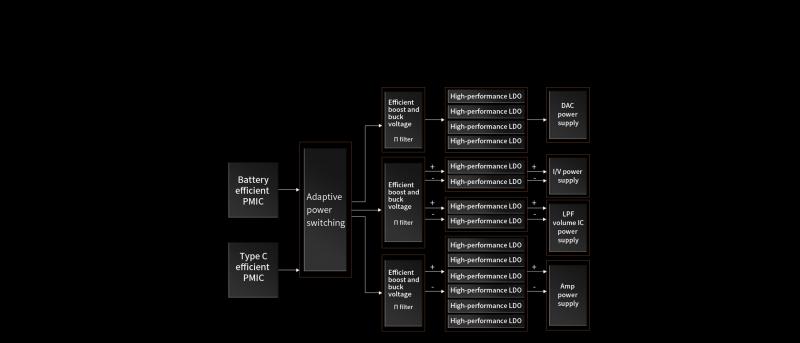 Extremely high dynamic range and ultra-low distortion ensure accurate reproduction of sound details, delivering rich and clear sound. The device features two dual-channel, ultra-low-noise ES9312 regulators working in conjunction with the two ES9039SPRO chips. This setup uses four independent power supplies, each dedicated to one of the four differential modules, resulting in enhanced dynamic range and ultra-low noise.