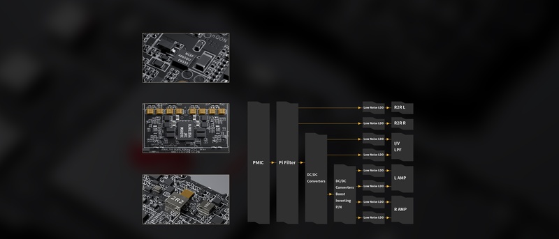 There are independent power supplies for digital and analog stages. The analog stage utilizes three separate power circuits for the R2R array, pre-amp, and amp stages, ensuring a more refined and natural sound signature.