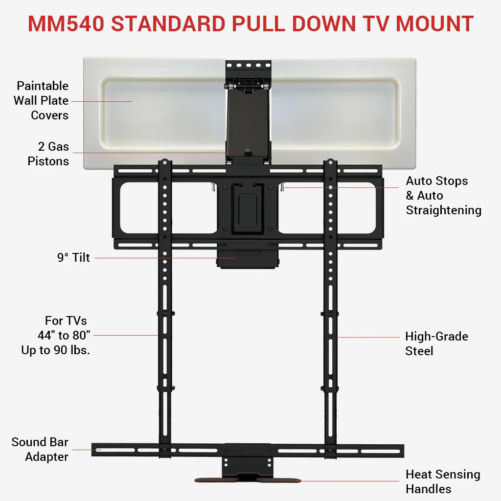 The MM540 Enhanced Mount gives you true safety, complete functionality, the incomparable MantelMount® engineering & craftsmanship, PLUS the premium features...all in one Pull Down TV Mount!