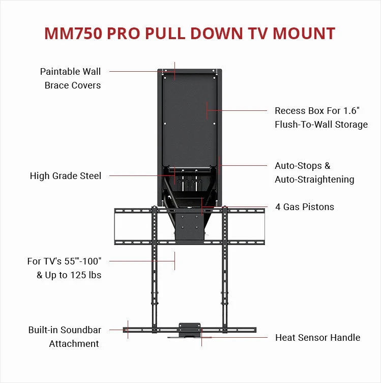 The award-winning MantelMount presents the new MM750, the second iteration in its Pro Series Manual Pull Down TV Mount line. This mount was deigned to handle larger, heavier TV's through a combination of higher grade steel, the use of four top echelon gas pistons instead of two, enhanced torsion rigidity, and a tubular tapered lifting arm. That MM750 provides an even smoother full range motion than its MM700 predecessor, increased off-the-wall and vertical travel distances, enhanced leveling for post-install leveling adjustments AND "Stop Anywhere Positioning" along the downward path of travel. The MM750 also comes standard with a solid steel housing that conceals the lifting arm when in the raised position. The housing can be surface mounted or recessed for 1.8 inch flush-to-wall TV storage. This Pro model is for home theater connoisseurs who only want the finest in everything.