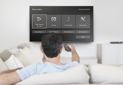 Easily control the receiver with your Smart TV remote via the HDMI CEC functionality associated with your Smart TV. Simply set “HDMI Control” to ON in your receiver, then set “Smart Menu” to ON to begin controlling the NR1510 with your TV remote. The Smart Menu home screen gives you quick access to source and surround mode selections, the AVR setup menu and four Smart Selects.
