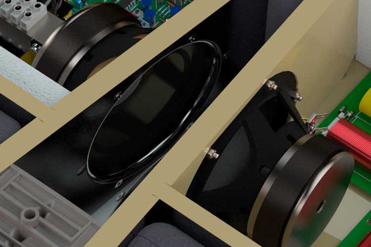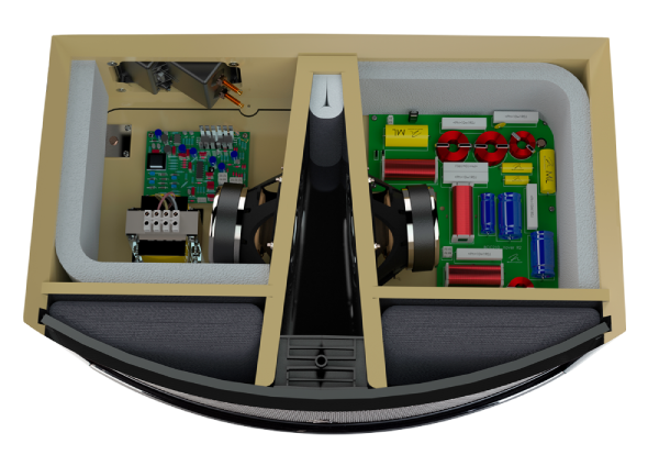 Instead of taking up space by positioning the woofers on each side of the electrostatic panel, they’ve designed a central slot inside the cabinet for the woofers. Now, the dual woofers reside in a well-braced enclosure located behind the tweeter and electrostatic panel.