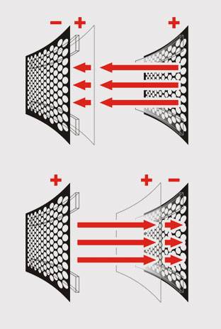 When the speaker is operating, the diaphragm is charged with an electrostatic field of fixed positive voltage. The two stators, between which the diaphragm is stretched, are charged with voltages of equal strength but opposite polarity. These charges occur in instantaneously alternating pulses according the signal received from your audio equipment. When the charge on one stator is positive, the charge on the other is negative. Because like charges repel and opposite charges attract, the diaphragm's constantly positive charge will force it to move forward or backward depending on the stator charges. With this movement, an electrostatic transducer translates an electrical audio signal into the diaphragm motion that produces sound waves in your room.