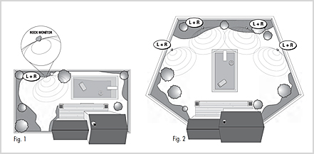(Fig. 1) or where a single speaker is preferred. In large, or unusually shaped areas, multiple rock speakers can be used to eliminate sound imbalances that occur with stereo sound as people move around or are seated closer to one speaker than the other (Fig. 2). For additional placement options, see your Dealer.