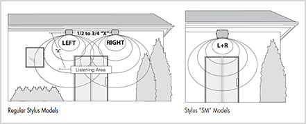In larger areas, multiple “SM” speakers eliminate sound imbalances that occur with stereo sound as people move around, or are seated closer to one speaker than the other. For details on all placement options provided by Stylus “SM” speakers see your Dealer.