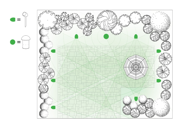 The Paradigm Garden Oasis Essentials Outdoor Music System is designed to deliver seamless, and evenly distributed sound coverage in an ‘open air’ environment. The illustration above shows how a daisy chain of satellite speakers and a subwoofer should be strategically placed to create even, balanced coverage around the outdoor environment. The satellite speakers should be spaced from 6 to 10 feet (2.4 - 3 meters) apart for optimal coverage. With a tighter spacing, more satellites will be required to fill out an area, but with the advantage of more consistent coverage and volume levels across the intended entertainment area.