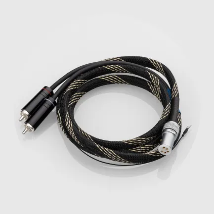 Interconnect cable with earthing wire, 2x RCA phono plugs to 1x 5-pole standard tonearm socket.