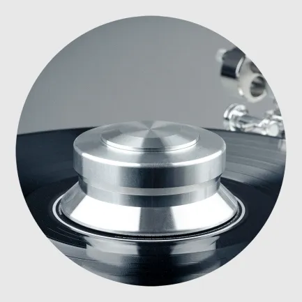 The 10 kg aluminium platter is TPE damped and sits on an inverted bearing which is magnetically decoupled. The vinyl layer on top is the perfect surface for your record.