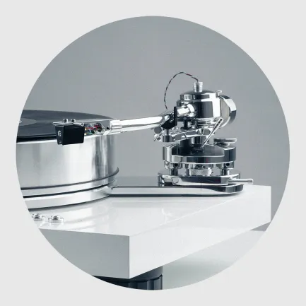 This high-end S-shape aluminium tonearm features a non magnetic low resonance construction with minimised bearing friction.