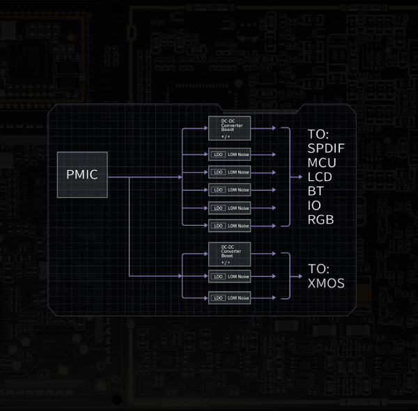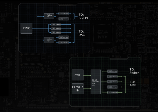Inside the Q15 is a 15-way digital-analog power supply, with power supply systems for the digital portion, analog portion, headphone amps, etc. 21 low-noise LDOs are distributed for accurate regulation, and 35 low-resistance tantalum capacitors distributed for abundant energy reserves.