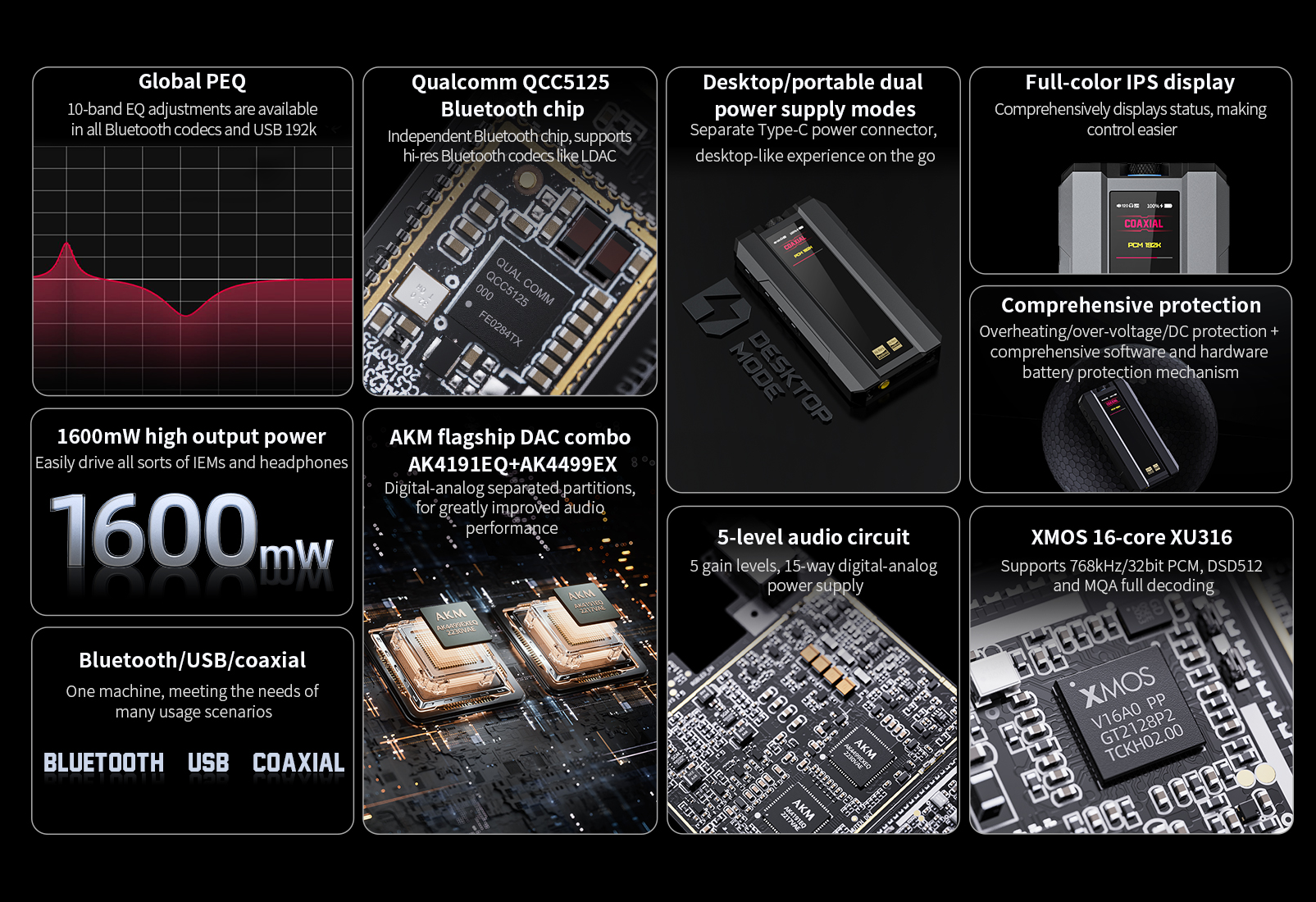Desktop/portable dual power supply modes | 1600mW high output power Bluetooth/USB/coaxial decoding | High-end QCC5125+XU316 | Global PEQ