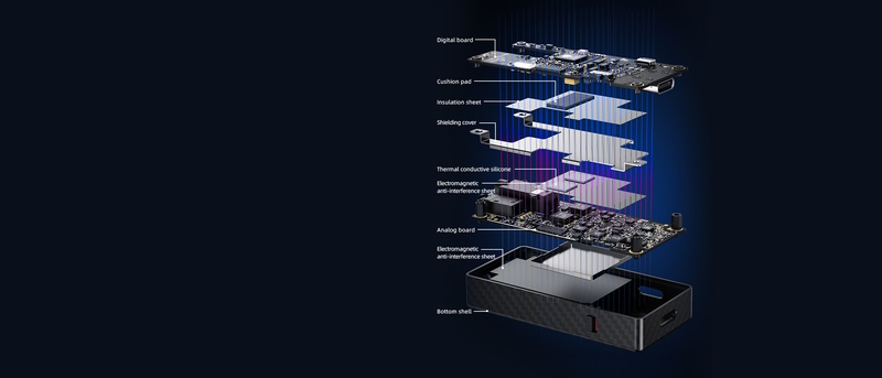The digital and analog boards are separated and equipped with a shielding cover for isolation, ensuring precise and dynamic signal processing. This design also effectively absorbs and dissipates heat, enabling effective thermal management and ensuring the QX13 delivers sustained high-power output.