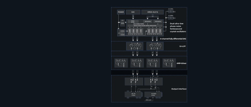 The chip features a fully differential audio architecture design with 8 channels set up in parallel, and is paired with a pair of ultra-low-noise ES9312 regulators for precise output matching on each audio channel. Audio signals are accurately restored thanks to this pair of chips’ optimized power efficiency and effectiveness in reducing clock jitter.