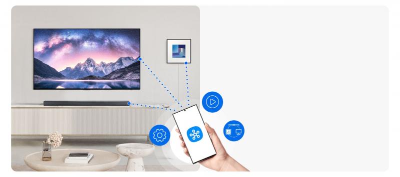 * Requires a mobile device running on Android 9.0 or above or iOS 15.0 or above (subject to change on software update) with the SmartThings app installed. ** Each device must be connected to Wi-Fi network. *** Must download and install the SmartThings App. **** Requires a Samsung account. ***** Group play can support up to five devices and must be connected to 5Ghz on the same Wi-Fi network. ****** Available functions may vary by region, service provider, network environment, or mobile device, and are subject to change without notice.