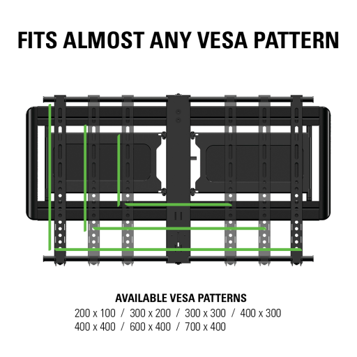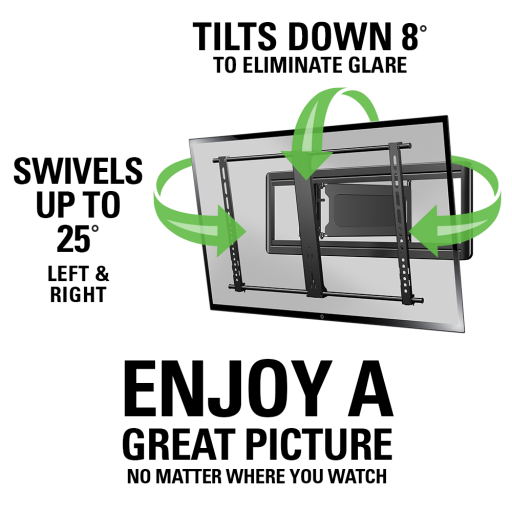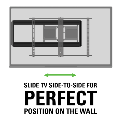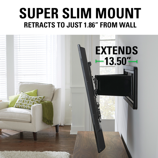 The VLF613 super slim full-motion mount lets you enjoy a great picture no matter where you watch. Tilt, swivel, extend and level your TV without the need for tools. Unsightly cables stay concealed, and tool-free assembly ensures a quick and easy installation. TV can slide from side-to-side for perfect positioning on the wall, and safety tab provides a safe and easy connection you can hear