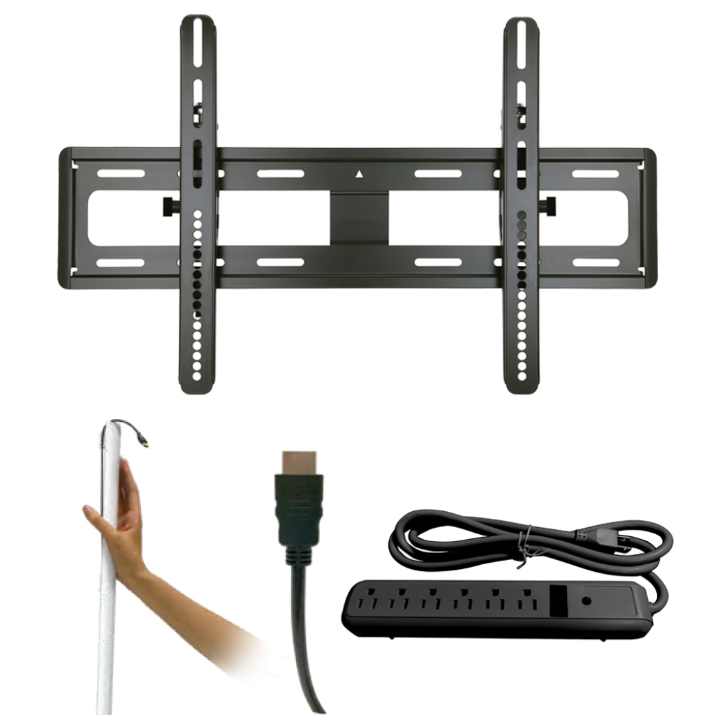 - Kit includes everything you need for a complete, finished install: Large tilting wall mount, 6-outlet power strip, 12' 4K HDMI cable and 30" cable tunnel