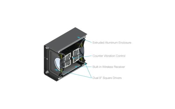 The Sonance D8 features two powerful vibration canceling 8" square drivers, wireless connectivity and our SonARC DSP technology, all within a sleek ultra-compact cabinet.