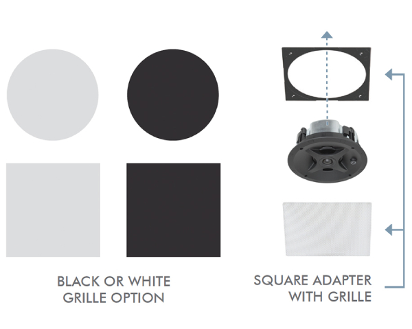 The optional Square Grille Adapter allows speakers to match the aesthetic of square downlights and HVAC grilles to achieve continual sight lines, as well providing an excellent solution for in-wall installations.