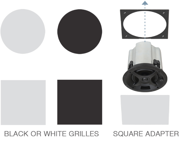 The optional Square Grille Adapter allows speakers to match the aesthetic of square downlights and HVAC grilles to achieve continual sight lines.
