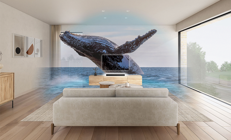 This 3.1ch Dolby Atmos®/DTS:X® soundbar features powerful, cinematic surround sound. Thanks to a newly developed upmixer, this soundbar delivers a three-dimensional surround experience even when you’re playing stereo content, like TV dramas, streamed music, and more. The centre speaker ensures clear dialogue, while the built-in dual subwoofer delivers you deep bass.