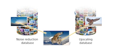Two powerful image improvement databases work together to improve picture quality in real time. One database helps reduce on-screen noise, while the other is used to upscale the resolution.