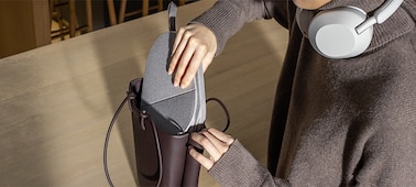 Carry your headphones effortlessly in the soft matching case. Take them out and the collapsible case can be made up to 40% thinner for easy storage in a bag.