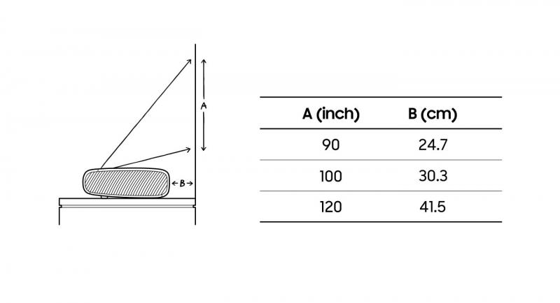 * Images are simulated and for illustration purposes only. The Graphic User Interface (GUI) specifications, which do not affect product performance, are subject to change without notice. ** Actual product may differ from image shown. Please see our product gallery. *** The laser projector can be projected on a flat white or bright monotone wall without setting up an additional screen. For a more optimized experience, using a screen dedicated to ultra short throw projector is recommended. **** The screen sizes for each projection distance may differ depending on the installation environment.