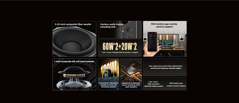 5.25-inch composite fiber woofer | 1-inch composite silk soft dome tweeter Independent 120W power supplies for main and secondary speakers Four-way independent power output 60W*2+20W*2 | Various audio inputs including XLR Low-noise, high-precision electronic volume control Supports Hi-res Bluetooth codecs including LDAC/aptX Adaptive | Two-stage bass and treble adjustment, and two low-frequency extension options FIIO Control app remote control support | Ten-band PEQ