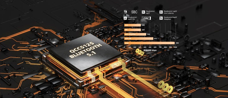 The SP5 is powered by a Qualcomm QCC5125 Bluetooth chip, offering 24-bit audio processing and an advanced DSP for an enhanced listening experience. It supports multiple Bluetooth codecs, including SBC, AAC, aptX, aptX LL, aptX HD, LDAC, and aptX Adaptive, allowing for high-end wireless sound quality. The SP5 can wirelessly transmit audio at up to 990kbps, allowing you to enjoy richly detailed wireless sound. Thanks to its high-resolution capabilities and support for LDAC, it has earned both Hi-Res Audio and Hi-Res Wireless Audio certifications.