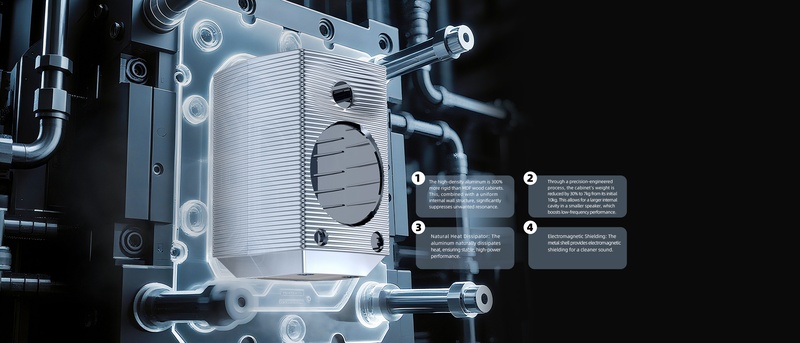 Each SP5 speaker cabinet is crafted from a single 10kg aluminum ingot that is melted and die-cast at 650℃. This cutting-edge metalwork pushes the boundaries of acoustic physics.