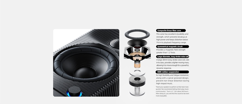 Diffuser-shaped horizontal stripes and a curved anti- standing-wave cabinet structure Effectively eliminate unwanted vibrations.