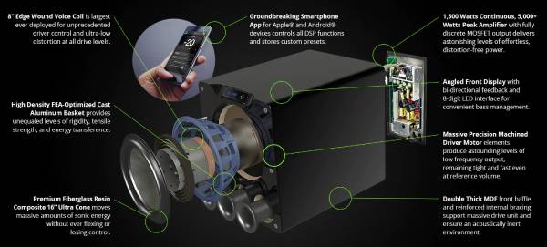 Pushing the driver are four massive, dedicated toroidal ferrite magnets that unleash a staggering 95mm peak to peak excursion and the highest levels of motor force and palpable SPLs. The light and rigid 16-inch Ultra driver cone consists of a premium fiberglass resin composite with optimal stiffness to mass ratio to maximize movement of air and sonic energy without ever distorting or losing control.