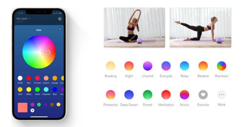 Personalize your favorite light settings using the vivid and luminous range of colors offered by the app. Customize or choose from preset modes to perfectly align with your mood. Set specific lighting settings with or without music for dinner, study, meditation, sleeping, and more.