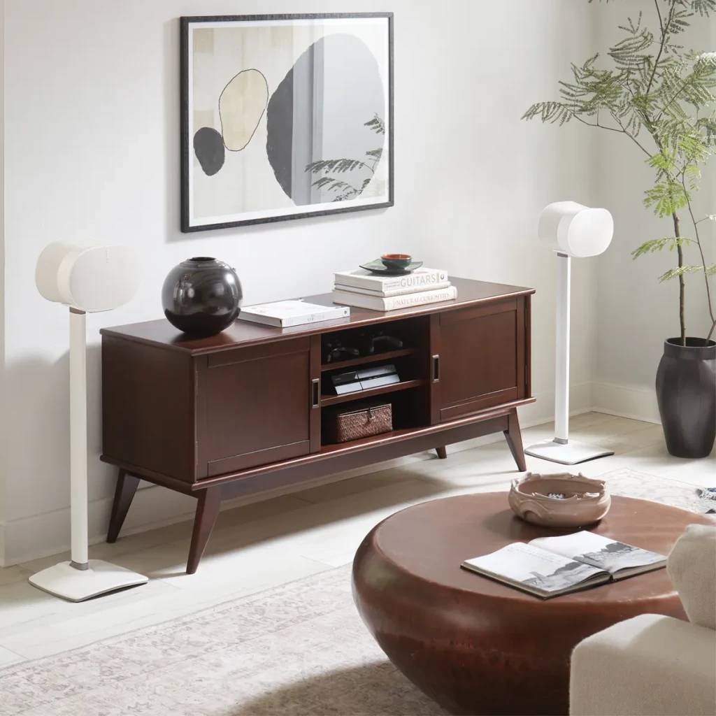 The SANUS Fixed-Height Speaker Stand designed for the Sonos Era 300™ offers the optimal listening height, cable management and sleek design. This stand is sure to deliver optimal audio performance regardless of your listening needs. Constructed of durable steel, and extruded aluminum, this not only resists wear, but also perfectly complements the aesthetics of the Sonos Era 300™ for a sleek, seamless look.